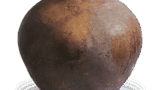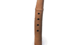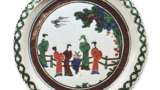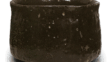 縦長の胴に短い口頭部をつけた、やや異形の仏花瓶です。口頭部が短いため、両側の不遊環の釣手が口縁部に達しています。肩に一段を有し、胴に梅花唐草文を繞しています。底部は張りのつよい高台を付けています。鉄釉は黒褐色のむらの多い軸調で、全体に黒味が勝っています。