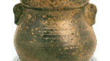 Seto ware: flower vase in the shape of bronze tsun, ash glaze. Excavated from Hachi-tönan Ceramic Kiln, Higashi Yamanaka-cho, Seto-shi, Aichi. 15th