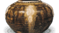 合子としては大形の部類に属します。このような大形のものは14世紀中葉代にしばしばつくられています。このころのものは低い口頭部をもつものが多いです。肩に菊花文を、男の四方に丸文四個を組にした印花文を押しています。鉄釉は明るい茶褐色の上に黒縞の出た飴釉で、小壺とはいえない豪奢な感じを出しています。