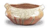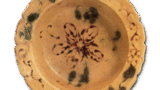 典型的な沓形茶碗です。 織部好みの沓形が美濃で焼かれ出すのは文禄年間であり、 唐津でもその影響を受けていますが、 後世、 織部唐津という言葉が生まれたのもこれらの作品を指してのことでしょう。口辺に段をつけた歪みの強い沓茶碗で、 高台は唐津らしくまるく素直に削り出され、畳付はやや広く、 高台内の削込みは浅いです。 口縁に鉄釉を塗りまわし、 胴の二方に一文字に鉄釉を刷き、その間に梅鉢や矢先風の文様を無造作に描いています。 内外にかかった釉はよく溶け、釉膚は青みをおびてよく焼き締まっています。 畳付に一箟線彫りをめぐらして、 二重高台風にしています。 甕屋の谷窯の作でしょう。