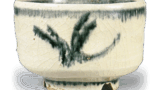 広口壺の胴に三本の沈線をめぐらしたいわゆる三筋壺は常滑独特の製品であるかのようにいわれていますが、最近では各地の瓷器系中世窯において焼かれていることが明らかになってきています。その初現的なものは11世紀末の猿投窯にあり、常滑のそれはその広がりの一環として生まれたものです。この三筋壺はまだ胴に膨らみをもっていることや、胴の三筋文が明瞭な複線であることから、12世紀初めごろの作品と考えられます。素地はやや鉄分を含んだ緻密な土で、赤く発色しており、その上にかかった鮮緑色の灰釉と調和して見事な色調を呈しています。数多い常滑三筋壺のなかでも、優品の一つに数えることができましょう。