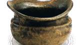 14世紀後半代から大甕をそのまま小さくした広口の算盤玉形の小形甕が出現してきます。常滑では後世の利休の命名に因んで、「不識」と呼んでいますが、その本来の用途は明らかでありません。中世墓地から蔵骨器として発見される例がかなり多いです。本器はその初期に当たるもので、口縁の一部に片口状の注口をつくっています。