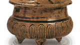 肩に施された文様は、三条の平行沈線の間に、同じ施文具を用いて円弧を八の字状にひき、その中間に蛇行する平行沈線文を配したもので、渥美窯刻文壺の一つのパターンを示しています。前者同様、焼成は良くありません。