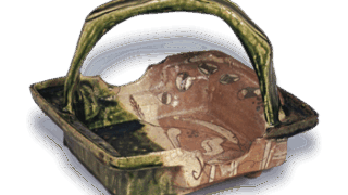 肩の張った背の低い広口の壺とも甕ともみられる器形のもので、従来あまり知られていない例です。底部の大きいのが特徴的です。灰白色の緻密な土で、紐土巻き上げ轆轤成形で、胴下半は箟削り調整を行なっている。肩に暗緑色の自然釉がかかっています。材質や焼成からみて、12世紀初めごろの猿投窯のうちに入れるべきものでしょう。