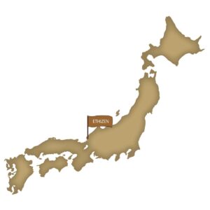 越前古窯は福井県南部の、丹生郡越前町平等および同宮崎村熊谷を中心とし、越前海岸に急斜面を見せる城山(標高513m) の東麓に派生する各支丘の南斜面にそれぞれ群をなして分布し、南北5km、東西3kmの範囲に、現在、約百六十基の古窯跡が発見されています。それは丹生山地の中央を北に流れ、織田町で東折りして南越盆地に流れこむ天王川の西部丘陵であり、東部丘陵は須恵器窯の分布地域であって、両者は截然と区別されています。ただ近年、宮崎村小曾原地内において、平安末に遡ると考えられる古越前の窯が数多く発見されており、越前窯の発生が、須恵器窯跡群の分布地域内において始まったことが知られるようになりました。それを別にすれば主要部分は西部丘陵にあり、南から曾原・増谷窯、熊谷窯、小熊谷窯、平等・ 大釜屋窯、焼山窯、織田窯、山中窯の七支群が知られています。これらのうち、とくに窯の多いところは熊谷窯中の奥釜井谷窯十七基、上ヶ平窯十五基、平等 大釜屋窯中の上大師谷東窯十数基、同西窯十五基などである(87頁分布図参照)。