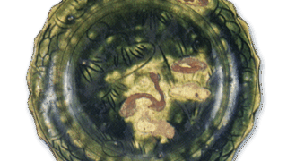 口頸部をしぼったこの形態のものは通常、壺と呼び慣わしていますが、さきの嘉元四年銘のものと同形であり、銘文に 「か免」 と記されている以上、甕形態として扱うべきでしょう。この形態は本来、須恵器の甕に由来するものであり、中形甕の系譜をひくものでしょう。鉄分の多い、きめの細かい土を用いており、赤褐色の肌に越前特有の黄緑釉が薄くかかっています。肩に二箇所、四条の櫛目で描いた十字文様の刻文が施されていますが、単なる窯印というよりは装飾的効果を意識しているように思われます。口縁端部1.3cmの縁帯の内側はいわゆる樋口になっており、肩の張りや胴下半の形状からみて、13世紀後半に遡るものでしょう。底裏に下駄印を有します。