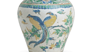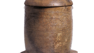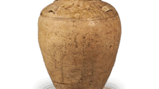 肩に暗緑色の自然釉が被っていますが、ほとんど剝落し灰白色をしています。底部は大きく、器形の上からみて15世紀代に入ることを示しています。