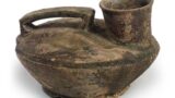 長さ3.5cmの口頸部の尖端を折り返してN字状口縁を形づくっています。やや粗い土味で、黒ずんだ褐色の色調を呈します。底部が大きく胴径にちかいことや口縁部の形状からみて、15世紀の中ごろにその製作年代を比定することができましょう。肩に△印の範描きの刻文があります。