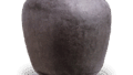 珠洲焼の施文法はわずかな草花文をのぞくと櫛目文に尽きますが、この壺ほど櫛目文を駆使したものも珍しいです。胴中央部に大きな櫛目波状文を描き、その上から縦引きの櫛目を施し、肩には斜格子状に櫛目文を描いています。さらに口縁端面にも櫛目波状文がみられ、櫛目施文最盛期の作品です。比較的緻密な良質の陶土を用いており、よく焼き締まっていて、肩の一部にかすかな黄緑色の自然釉が被っています。成形はまず底部をつくり、その上を紐づくりで継いで、粗い刻目のある叩きによる成形後、節削りによって叩文を消し、器面調整を行なっています。胴下半部にその名残りがみえています。飾られた壺の整形はこのような手法が一般にとられたらしいです。鎌倉後期の代表的作品の一つです。