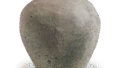口頸部は細くしまり、中央のふくらみは上方に移って、口縁下のくりこみのようにみえます。口縁は外に折り曲げてまる味のある縁帯をつくっています。紐土巻き上げづくりで、底部を一定の高さまでつくり、彎曲を変えて上へ積み上げています。器面の叩文をで削り整形していることが胴中央に残された叩文の痕跡から知ることができます。焼成はあまり高くありません。器面炭化して光沢のある黒色を呈します。