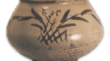 須恵器の製作技法を踏襲した中世陶器の東日本の代表を珠洲焼に求めるならば、西日本のそれは岡山西部の亀山焼でしょう。しかし珠洲がいかにも黒々と固く焼き締められているのに対して、亀山は灰色ないし灰褐色を帯びたやや瓦器質にちかい焼成です。短く立ち上がる口頸部の上縁を外開きに屈折させた比較的薄手のつくりで、肩はつよく張り出し、底は大きくて安定感に富んでいます。鎌倉中期の亀山壺の典型例です。粘土紐巻き上げつくりで、器面は格子の叩目によって整形していますが、胴下半は削り調整によって叩文を消しています。底部に下駄印があります。焼成はややあまく、意外に重量が軽いです。亀山焼のなかでは薄手の精品の部類に属します。
