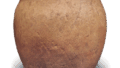 短い口頸部の上半を外反させ、折り返してやや幅のある縁帯をつくっています。さらに上面を平坦にしています。器面は細かい格子目の叩文を、内面は同心円の叩文を押しており、内外両面から叩き締めています。須恵器の甕の成形手法を踏襲したものでしょう。底は径の大きい平底で、わずかに上げ底になっています。土が弱く、口縁の焼き歪みが著しいです。