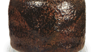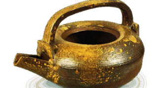 肩の張ったやや歪な形の壺です。胴は五段に屈折していて、成形手法のよく判る外形をしています。紐づくり巻き上げによって一定の幅まで接ぎ足してゆく様がありありと出ています。長石の吹き出しはありますが、緻密な土でよく焼き締まって茶褐色を呈し、器面は滑沢を有します。薄手のつくりで、肩から胴の一部に暗緑色の自然釉が流れています。