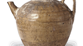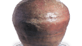 外開きに直立する口頸部の先端を平縁につくった大壺です。胴形に算盤玉の形を留めていますが、肩がかなり丸く、15世紀へ入る作と考えられます。信楽特有の石英、長石の吹き出しの多い土味のもので 紐土巻き上げづくりで胴を六段に継いで成形しています。焼き上がりは良好で、薄赤色の器肌の肩に黄緑色のごまふり状の自然釉がかかっています。
