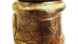 伊賀 壺 中世信楽備前丹波伊賀 壺 2024.01.13 伊賀 壺 Iga ware: jar. 15th century. Height 38.5cm.14世紀高さ38.5cm 口径13.9cm 胴径34.4~35.0cm 底径15.0cm 紐土巻き上げの胴部六段はぎづくりです。継目の凹凸がよく見えています。比較的薄手のつくりで、よく焼き締まり茶褐色をした器肌に黄緑色の自然釉がかかっていますが、長石と融合して白濁化し、さらに流れた暗緑色の釉は窯変して、きわめて変化に富んだものになっています。底裏に下駄印および三方に焼台の痕がある。