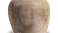 備前焼があの独特の赤褐色の火色をみせ始めるのは鎌倉時代後期に入ってからのことです。このころにはまだ還元焼成の壺も操業されており、灰色のものもあって、火色のみで時代を決めることはできません。この壺は短く立ち上がる丸口の口頸の直径が底径とほぼ等しく、なで肩の形態から鎌倉後期の作品と考えられます。紐づくりの比較的薄手の成形で、焼成火度が高く、かなりの焼き歪みを生じています。肩に三条の平行沈線を引き、上二条の間に楕円を二つ重ねた刻文が描かれています。胴の一部に他の器物の円形のくっつき痕があり、その外周が黒く炭化してはからざる景色をつくっています。口縁から胴の一部に白濁の自然釉が被っています。いま口縁から肩にかけ大きく破損欠失していますが、器面に溢れる火色の発色は古式の沈線文壺のなかでも最も優れており、鎌倉後期の代表的な作品の一つに挙げられましょう。