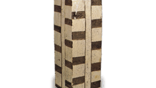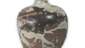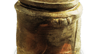 鉄分のややある土で、板起こしづくり。口縁を内側に折り曲げ、高台はべた底で、貝高台の跡が四か所残っています。全体を二重の横線で六区画に割り、一番上の口縁部に花文、その下の頸の部分は暦手印花、その下の胴の上部は交差する二重線を箆で陰刻し、胴中央部は雷文印花、その下方は暦手印花、腰の部分に雷文印花して白土象嵌しています。全体に長石釉がかけられています。