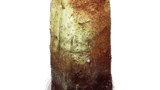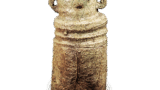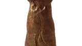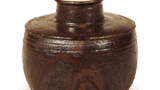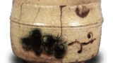 鍔のある幅広い縁帯は備前擂鉢の特有の形態です。鎌倉末ごろから広くなり始めた縁帯はやがて器壁の厚みを超えて垂直に立ち上がるようになり、外に溢れた部分は下に垂れ下がるか鍔状に外へ突き出されるかの二様の姿をとりました。素地は小石を多く含んだ鉄分の多い土で、よく焼き締まって黒褐色を呈しています。このころから黒褐色のものが多くなるのは、山土のみでなく田土を混ぜ始めたからでしょう。外面に石灰質の付着物が全面にみられるのは海中に長くあったことを示すもので、搬出に際して取り落としたものでしょうか。俗に「海揚がり」と称するものの一つです。