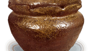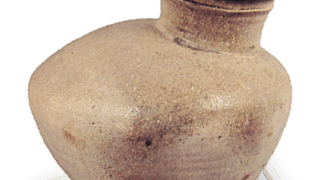 口頸部の大きくラッパ状に開いた小壺で、口縁の一端を大きくひねって片口をつくっています。油壺の一種でしょう。やや砂質の陶土を用い、水挽き轆轤成形で、裏に蓆状の圧痕がある。非常によく焼き締まって茶褐色を呈し、肩の半面に黄白色の自然釉がごまふり状にかかっています。この時期に数多い片口小の優品の一つです。