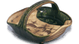 外反する口頸部の先端上部に面取りを施した丹波独特の口づくりをもった三耳壺です。耳は二本の粘土紐の合わせ耳で、古相を示しています。口頸部と肩の境に花弁をめぐらし、三耳の間に三枚重ねの菊花文を、中央花弁と耳の下に二枚の葉文を描いています。よく焼き締まった茶褐色の器肌の肩に濃緑の自然釉がかかっています。丹波初期の壺のなかでも稀にみる優品です。