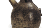 丹波の初期の壺には高さと胴径の相近い丸胴のものと細長い胴のものがある。前者は刻文のあるものであり、後者はこの壺とか兵庫県陶芸館の「布引」 (図150) などです。短い外反する口頸部、つよく張った肩、底に向けて直線的に細くなる胴部の形状は鎌倉後期の壺の特徴です。紐土を数段に接いで成形、器面は刷毛目横ナデ整形で 成形時の削り痕が胴下半に顕著にみえています。焼き上がりはきわめて良好で、茶褐色を呈し、肩にかかった濃緑の自然釉が胴下半にまで滝のように流下し、表面の一部が褐色に焦げて幽玄な雰囲気を出しています。数少ない鎌倉時代の大壺のなかでも最も優れたものの一つです。
