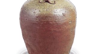 大きく外方に屈折させた口縁、肩の張りを失ってゆるやかなカーブをえがく胴部、小さな底部、それにもましてこの時期のより大きな特徴は、甕の口径が著しく拡大されたことです。丹波独特の甕の形態を完成させたというべきでしょう。きめの細かい良質の土を用いた精作で、よく焼き締まって赤褐色を呈し、口縁から胴の半面に鮮やかな黄緑色の自然釉が厚く被って、この甕を引き立たせています。肩に細い箟描きでKの窯印を刻んでいますが、このような小さな窯印を付けるようになるのも室町中期以降の丹波の特色です。数少ない室町時代の甕の貴重な遺存例の一つです。