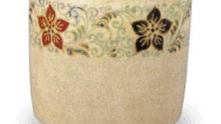 前者と同様な反口丸胴の大壺ですが、やや肩が落ち、室町初期ごろの作と考えられます。成形は紐土巻き上げづくりで器面は箟磨きによって滑沢を有します。焼き上がりはきわめて良く、肩にかかった濃緑色の自然釉の一部が胴下半にまで流下しています。胴に箟描きの窯印Xがある。