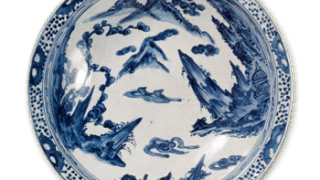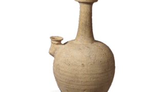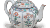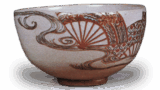 これは丁子を煎じる丁子風炉です。かつて厠などで丁子の皮を煎じて芳香を発し、臭いを消す風習がありましたが、京都ではこのような豪華な丁子風炉が一部の上流階級の間で使われたのでしょう。京焼の丁子風炉はかなり多く残っていますが、なかではもっとも優れた作例です。全体薄作りで、波濤文や雷文を上絵であらわし、釜の蓋や風炉には木瓜文や七宝文などを透かし彫りしています。