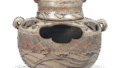 色絵獅子牡丹文団扇掛花入 京焼色絵獅子牡丹文団扇掛花入 X Facebook はてブ LINE Pinterest コピー 2024.02.17 色絵獅子牡丹文団扇掛花入 Round-fan shaped hanging flower vase with lion and peony design,enamelled wareHeight 22.5cm高さ22.5cm これも京焼ならではの手のこんだ作例です。団扇の裏面に長方の平らな花筒を取りつけた掛花入で、団扇の骨に七宝の透かし彫りをあらわし、扇面には獅子牡丹の文様を描いていますが、この種の京焼には珍しく赤の上絵を用いています。その文様から、元禄前後の作ではないかと思われます。