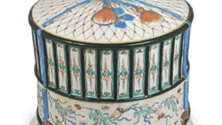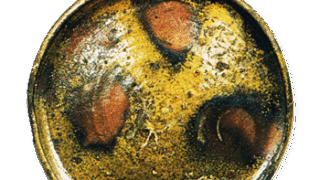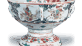 細く丈高の胴に注口と把手をつけた、いわゆる仙盞瓶ですが、かつて呉州赤絵ではこのような姿のものは見たことがありません。しかし頴川が模していますからには、本歌があったかもしれません。呉州赤絵を倣っていますので、作行きは全体にざんぐりとして、胴には飛鳳と菊の文様をのびやかに描き、注口と把手に小さな花を細かくあらわしています。高台は分厚く、高台から底まわりは土見せです。