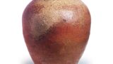 共箱の蓋表に 「南蛮急須 木米造」と書き付けています。木米の南蛮写の急須は煎茶家の間で声価の高いものであり、この作品も引き締まった姿がよく、また土膚も面白く焼き上がって、やはり他の追従を許さぬものがあります。全体に小振りの薄作で、把手の裏には木米の印が捺されています。