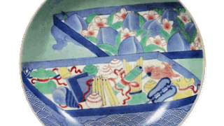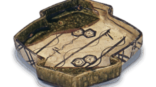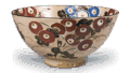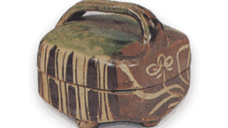 これも乾山写しの意匠で、笹の上に雪のかかった様子を鮮やかにあらわしています。また把手を竹にしているのも面白く、仁阿弥の作例のなかでは代表的なものの一つにあげられています。土見せの底に法螺貝の印が捺され、三方につけられた脚は七角に面取りし、口まわりには透しをつけています。共箱の蓋表に 「雪竹之画 手鉢 道八印」と書き付けし、法螺貝印を捺しています。