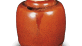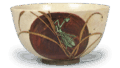 姿は「獅子」などと似て薄作り、口は蛤端、胴をわずかに引き締め、まる端正な高台は畳付幅広く、不規則に目跡が五か所に残っています。高台内に楽字の印が捺されていますが、総釉であるために判然としません。このように釉が上にかかった印を、俗に潰し印と称しています。漆黒の幕釉が内外ともに厚くかかっていますが、ことに外まわりは厚く垂れ下がり、しかも裾まわりに白濁の蛇蝎釉が激しくあらわれ、まさに 「あら礒」の銘のごとく、波頭を連想させるものがあります。この蛇蝎は、釉中の不純物が漂泊して自然にあらわれるものですから、これほど鮮やかにあらわれても厭味ではなく、稀に見る強烈な景色として茶碗の印象を深めています。道入黒茶碗の傑作の一つにあげられます。