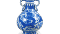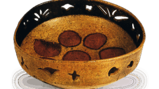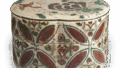 祥瑞を倣った杓立です。独特の器形で、口辺に円形の孔を六方に穿ち、胴裾は八角に作り、胴の上部に山水楼閣人物文、下部には松竹梅と草花の文様を四方に、また籠目や紗綾形などの幾何文を交互に配しています。開いた底の中央に 「長等山永楽造」の二行銘を二重円圏内に書していますが、共箱ではなく、箱の蓋表に「祥瑞譜 卓上花瓶 立二用ゆ」、蓋裏には「於湖南 長等山 家父保全造己夏 不軒 和全識 (花押)」 と、保全の子、和金が書き付けています。