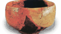 おそらく道入の赤楽茶碗としては初期の作ではないかと思われ、その器形はやはり長次郎焼を基本としているように思われます。口部はわずかに内に抱え、胴を引き締め、腰はまるみをもたせつつやや腰高に作られています。高台はくっきりと削り出され、高台畳付は平で、高台内には楽字の印がはっきり捺されています。素地の上に黄土を刷毛で塗り、その上に釉をかけたもので、釉色はあたかも飴釉のように変化しています。さらに裾まわりから胴にかけては一部火変りを見せ、また一部に黄色に刷毛目があらわれています。道入の赤楽茶碗中の代表的な作品の一つです。内箱蓋裏には「ノンカウ赤茶碗 寒菊(花押)」 と一燈が書き付け、外箱には「ノンカウ赤茶碗又玄斎書付 寒菊トアリ (花押)」と不見斎石翁が書き付けています。