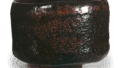 全体薄く成形された大振りの平茶碗です。口に起伏をつけ、胴を締めた力強い作行きです。見込には浅く茶溜りを作り、高台は小振りで、畳付は狭く長次郎の平茶碗を倣った形ですが、一入の手ぐせが十分に示された茶碗です。総体にかかった釉はあまり滑らかではなく、外側から見込にかけて朱釉があらわれています。箱蓋裏に「黒平茶碗 不審 (花押)」 と随流斎が書き付けています。一入生存中の表千家宗匠の書付のある箱に収まったものは極めて少ないです。