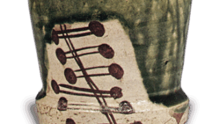 胴を強く締め、口を内に抱え込ませた小振りの平茶碗で、腰の下は斜めに立ち上がらせて、小振りの高台をつけています。総体にかかった黒釉は滑らかによく溶け、外側の二方に朱釉があらわれています。