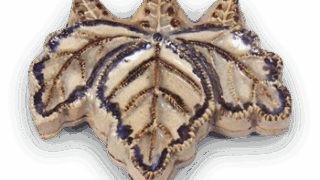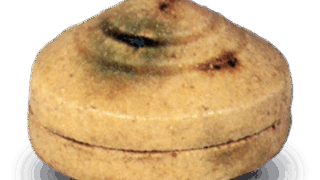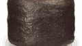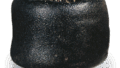 口をわずかに抱え込ませた、おとなしい作振りの筒茶碗ですが、胴に幅の広い縦目をかすかに加えています。高台は大振りで畳付は狭く、高台内は深く削り込まれています。しっとりと光沢のあるかせ釉が総体にかかり、高台内に印が捺されていますが、釉がかかっているので判然としません。高台畳付には目跡が三つ残っています。箱蓋裏には九代了入が 「宗入作 黒崎茶碗 九代了入印」と極め書し、隠居印を捺しています。