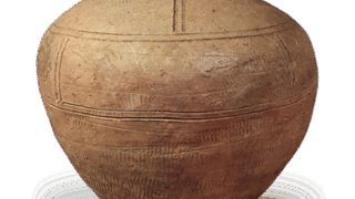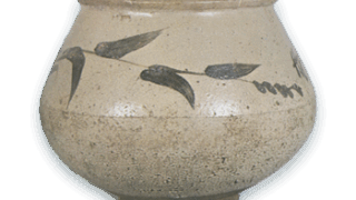 彫りに金彩を加えて注連縄と玉の絵を描いているこの茶碗は、正月用に作られたものです。半筒形小振りの茶碗で、高台は小振りで、畳付も狭く削られています。全体にかけられた黒釉は柚膚状によく溶け、高台内には楽印が捺され、目跡が三か所残っています。共箱の蓋表には 「注連玉之絵 黒茶怨 楽吉左衛門 印」とあり、吉左衛門を名乗った十八歳から二十六歳までの間の作品であることがうかがわれます。