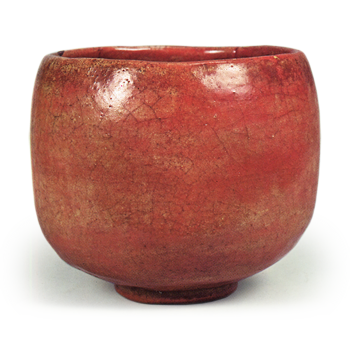 共箱の蓋表に「光悦写 赤茶碗 楽吉左衛門 」 とあることか入が光悦の茶碗を倣った作品であることが知られます。口縁は鏡を平らに切りまわし、口辺に強く縦を施し、見込や底を平らに作るなど、この茶碗は加賀光悦を写したものでしょうが、作振りはかたくやや小振りです。高台も加賀光悦風に低く単純な円形に削られ、畳付には目跡が三つ残っています。全面にかけられた釉はよく溶けて鮮やかな赤みを呈し、胴裾に深く印が捺されています。この作品も吉左衛門を名乗っていた時代の作品です。