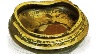 口部に大きく起伏をつけ、腰をまるく作った平茶碗に近い大振りの茶碗です。全体厚作りで、見込は広く、まるい底には小さい高台がつけられています。高台内の削込みを小さくし、畳付を平らに幅広く作り、外側は平らな俺を使って変化をつけています。全面にかけられた厚い釉は滑らかによく溶け、外側の一部に黄はげがあらわれています。高台脇に中印がくっきりと捺され、目跡が三つ残っています。