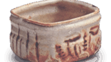 口部をわずかに内に抱え込ませたおとなしい姿の茶碗で、全体に薄作りです。見込に茶溜りを削り出し、底に低くやや大振りの高<ypf_75317_22.txt>台がつけられています。高台内を残して全体に黄土を塗り、透明釉をかけた赤楽ですが、いわゆる砂釉で、緑色の火変りも鮮やかに焼き上がっています。高台内中央に紀州徳川治宝侯から拝領の楽印がくっきと捺され、旦入三十二歳から五十一歳までの間の作である。内箱蓋裏には玄々斎が 「赤茶碗 花摺衣ト呼 玄々 (花押)」と書き付け、底には旦入の書付があります。
