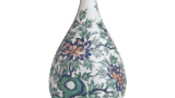 緩やかに五岳をつけた口部は、口縁を薄く作り、内に抱え込ませまた弘入独特の作振りで、胴裾をわずかにすぼめています。小さな円形の高台は畳付を広く、高台内外を広く土見せにしています。胴の一部に白抜きの景色をあらわし、他にかかった黒釉は美しく溶けています。