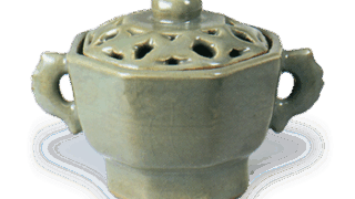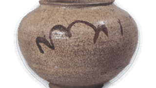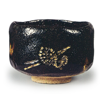 弘入、惺入合作の茶碗です。箱の蓋表に惺入の筆によって 「合作 黒茶器 楽吉左衛門初造」とあり、高台脇に 「大正九年妹日造之」 と箟彫りされています。したがって弘入六十四歳、三十三歳で家を継いだ惺入三十四歳の初作りであるらしいです。腰の強く張った半筒形の茶碗で、畳付の広いがっしりとした大振りの高台がついています。高台と高台まわりに白くざんぐりとした土を見せ、他には黒釉をかけ、釉膚はやわらかく焼き上がっています。胴の一方に垣根のような文様が黄はげ状に描かれ、深く削り込まれた高台内には惺入見込釉下には弘入の隠居判が捺されています。箱蓋裏には惺斎が 「銘合 左 (花押)」 と記しています。