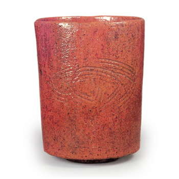 一見、一入の朱釉黒茶碗と見まごうばかりの作振りです。しかし一入の作とくらべるとどこか固さが感じられます。ことに口造りに一入と違った手ぐせがあらわれています。総体やや厚く、口を内に抱え込ませ、胴をわずかに引き締め、腰はまるく腰高に、高台は小振りで畳付はまるく、高台内に巴の兜巾が作られています。また、見込にも茶溜りがくっきりとあらわされています。総体に黒釉がかかり、鮮やかに朱釉があらわれ、特に幕釉の釉切れには朱釉が帯状にあらわれています。朱釉の発色も一入のそれと比べますと、赤の色調がやや強いようです。高台畳付には目跡が三つ残っています。内箱蓋表に「黒茶碗 兄弥兵衛作」、裏に 「黒茶わん 兄弥兵衛作 任 (花押)」と玉水焼三代の任土斎が書付をしています。したがってこの作者は、一元と称されているが一元ではなく、任土斎の兄、すなわちー空弥兵衛と推測されます。一空弥兵衛は一元の長男で、二十二歳で歿したがなかなか巧みな作者であったと推測され、この種の玉水焼一元、一空などの朱釉茶碗が、一入の作として多く伝世しているようです。