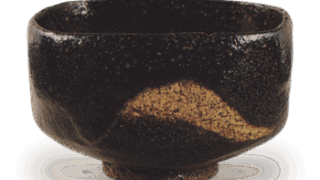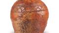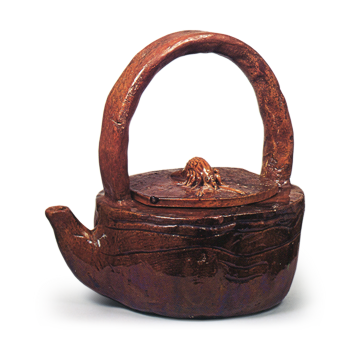 胴を締めた瓢形の水指で、ざんぐりとした手捏ねらしい作振りです。しかし、口まわりの作りや肩にめぐらされた線彫りはなかなか非凡なできばえです。信楽の水指を写したものらしく、全面にかかった飴釉は薄く、釉の下に砂気の混った土膚があらわれていてむしろそうした素地膚のおもしろみを生かして飴釉をかけたものと思われます。底は渦状に箟で平らに削り上げ、縁まわりに畳付を細く残しています。胴には大きく幅広の縦箟目を入れ、底の内側には飴釉ではなく赤楽釉をかけています。侘びの茶にふさわしい作振りです。