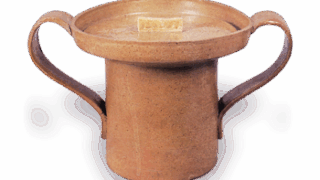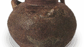 胴を弓形にした姿は、おそらく初代大樋の作行きを倣ったものでしょう。胴には箟目がめぐらされ、高台は小さく小振りで、高台内の削込みも小さいです。見込には楕円に茶溜りを浅くつけ、全面に薄く飴釉がかかり、さらに幕釉のように内外に青みをおびた白い釉がかけられています。また、胴の一方に玉の絵を白泥で釉下に描いています。