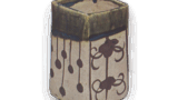 腰から口部にかけて緩やかに立ち上がった椀形の茶碗で、高台は小振りに作られています。高台際から腰にかけて、平たく面取箟をめぐらしています。全面に濃い飴釉がかかっていますが、よく溶けて光沢があり、紫色をおびています。高台脇に印があり、内箱蓋裏に 「大樋銘黒主 寒雲(花押)」 と円能斎が書き付けています。八代大樋長左衛門の作である。