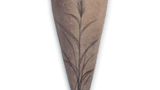 備前焼の水指は数多く伝世していますが、これほど土浦の柔らかく焼き締まった作は他に見ない。ずっぽりと水に濡らすと鮮かな赤みを見せ、斜めに生じた灰黒色のこげ膚との対照が美しい。姿も矢筈口水指のなかでは大振りで、しかも堂々としています。口はかなり強い角度で内にすぼまった矢筈口で、一部山割れが生じたあとを砕き落としたらしく、欠失しています。左右につけた大きな耳も、器形によく調和しています。胴には轆轤目がめぐり-横に六筋と縦に三筋の箆目が施され、底は平底で中央が少し持ち上がり、そこに「干」の窯印が箆彫りされています。備前の矢筈口水指のなかでは初期のものではないでしょうか。共蓋が添っています。