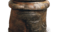 伝世の水指のなかでは最も変化に富んだ景色に焼成され、作振りは肩と裾に段をつけ、全体やや小振りに成形されています。口は開きぎみに低く立ち上がらせて矢筈口風に作り、左右についた耳には縦に二本切込をつけています。おそらく当初からのものと思われる薄作りの蓋がついていますが、窯変の景は蓋にいたるまでまことに鮮かでしょう。見込に馬蹄形の窯印が刻されていますが、この窯印をもつ作者は、水指や花生を盛んに焼造したらしく、かなりの作例が残っています。作行きはいずれも巧味があり、作為がかなり強く、ことに箆彫りをよく駆使しています。おそらくは慶慶長頃の代表的な陶工の一人であったのではなかろうか。平らな底にくっつきが二か所残っています。